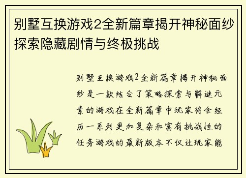 别墅互换游戏2全新篇章揭开神秘面纱探索隐藏剧情与终极挑战