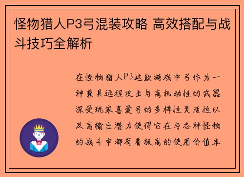 怪物猎人P3弓混装攻略 高效搭配与战斗技巧全解析